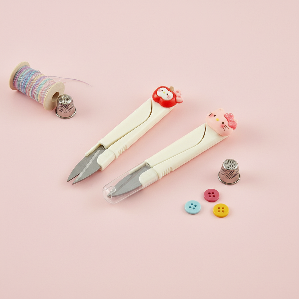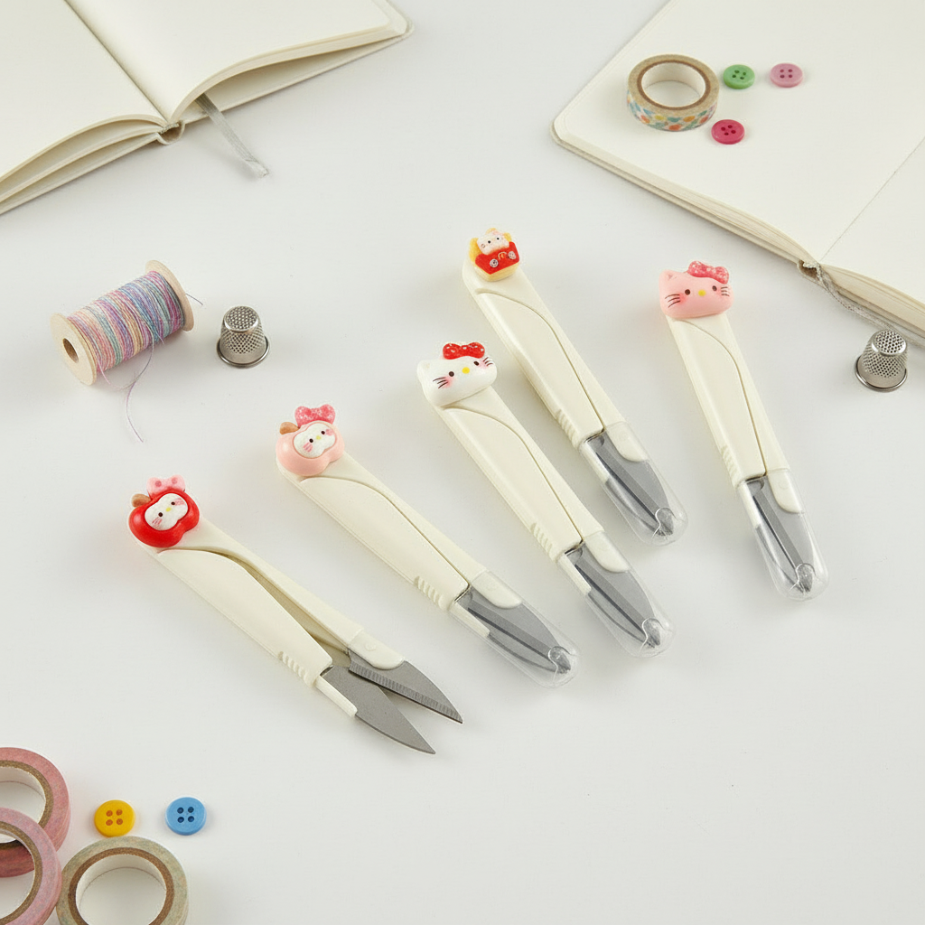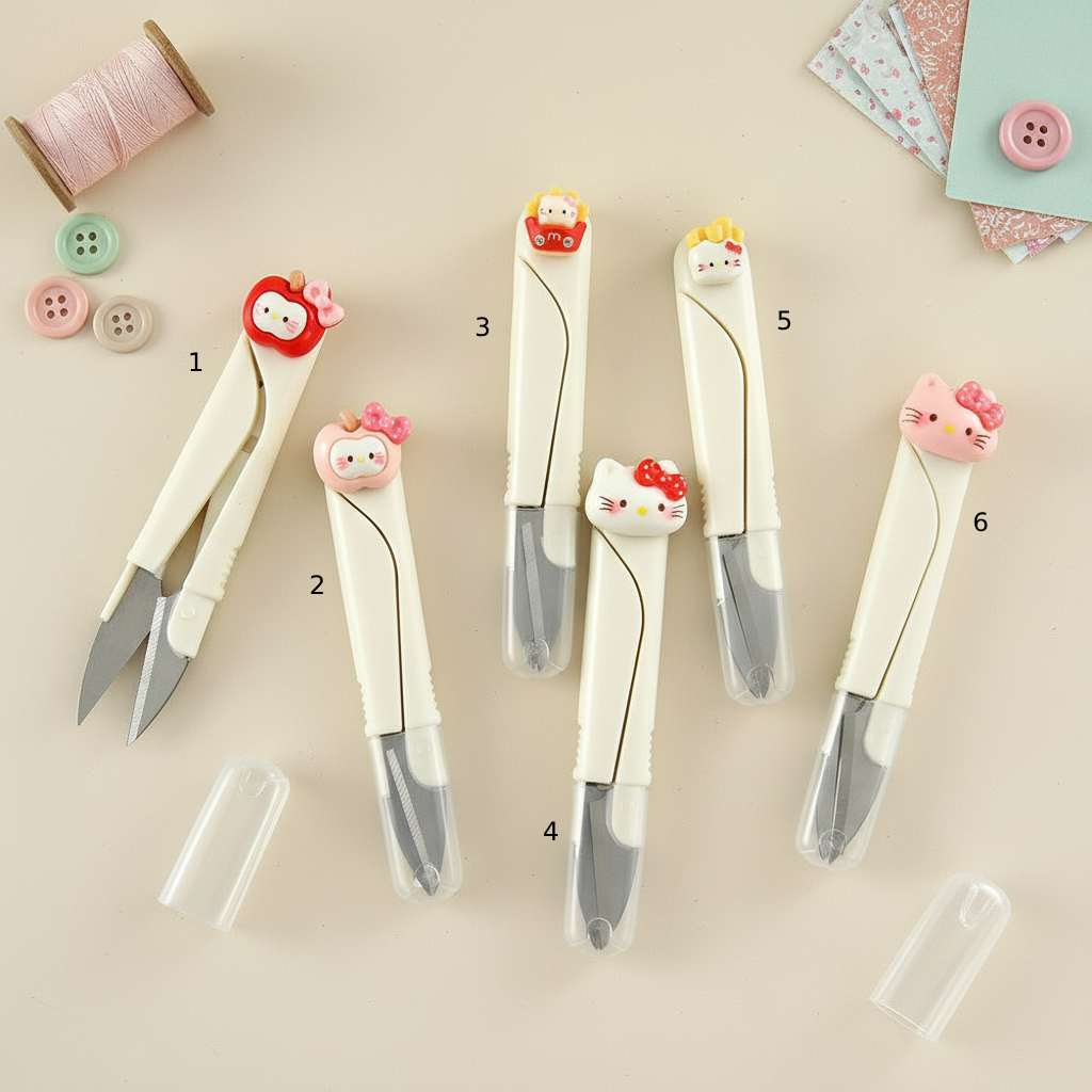 ظاهر این قیچی بسیار جذاب و “کیوت” (Cute) است. عروسکهای برجسته و ۳ بعدی (مانند کیتی، سیب و سیبزمینی سرخکرده) در بالای دسته، زیبایی میز تحریر شما را افزایش میدهند. بدنه پلاستیکی باکیفیت و خوشدست، مانع از لیز خوردن قیچی در دست شماست.