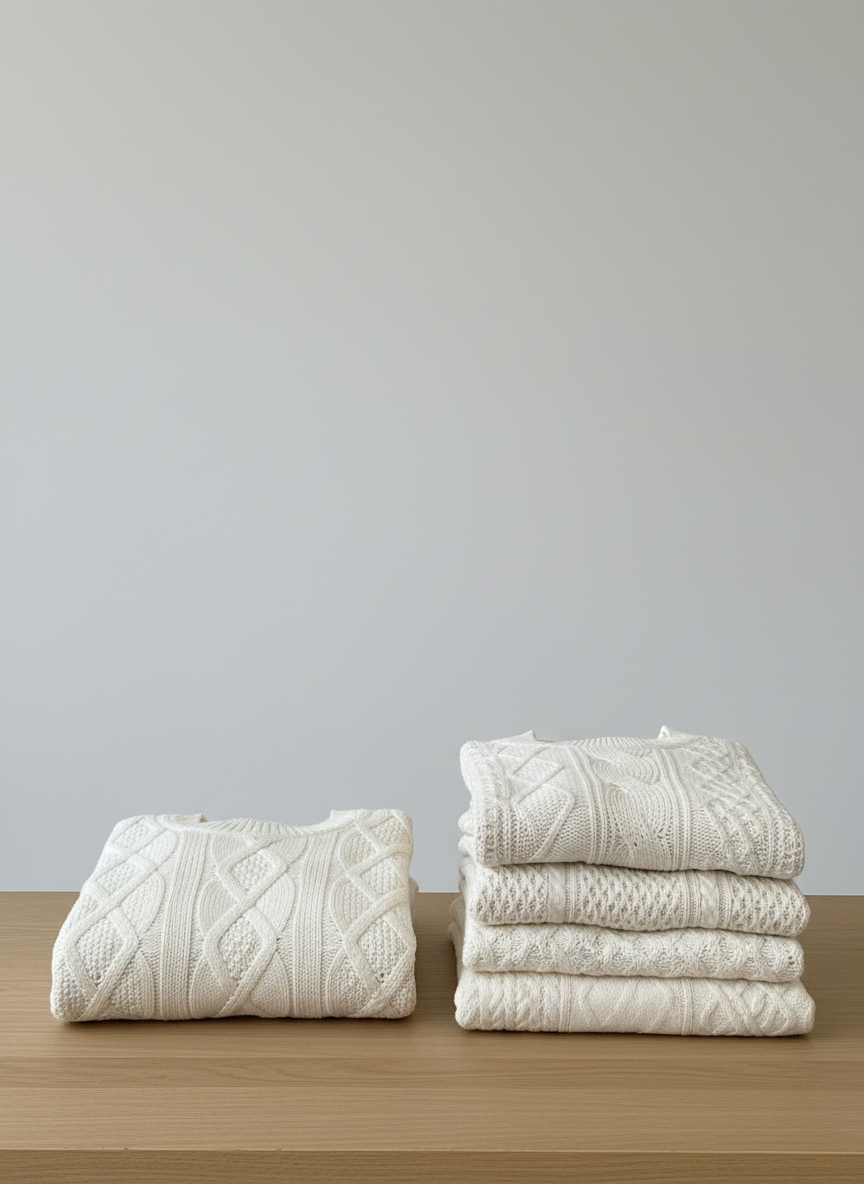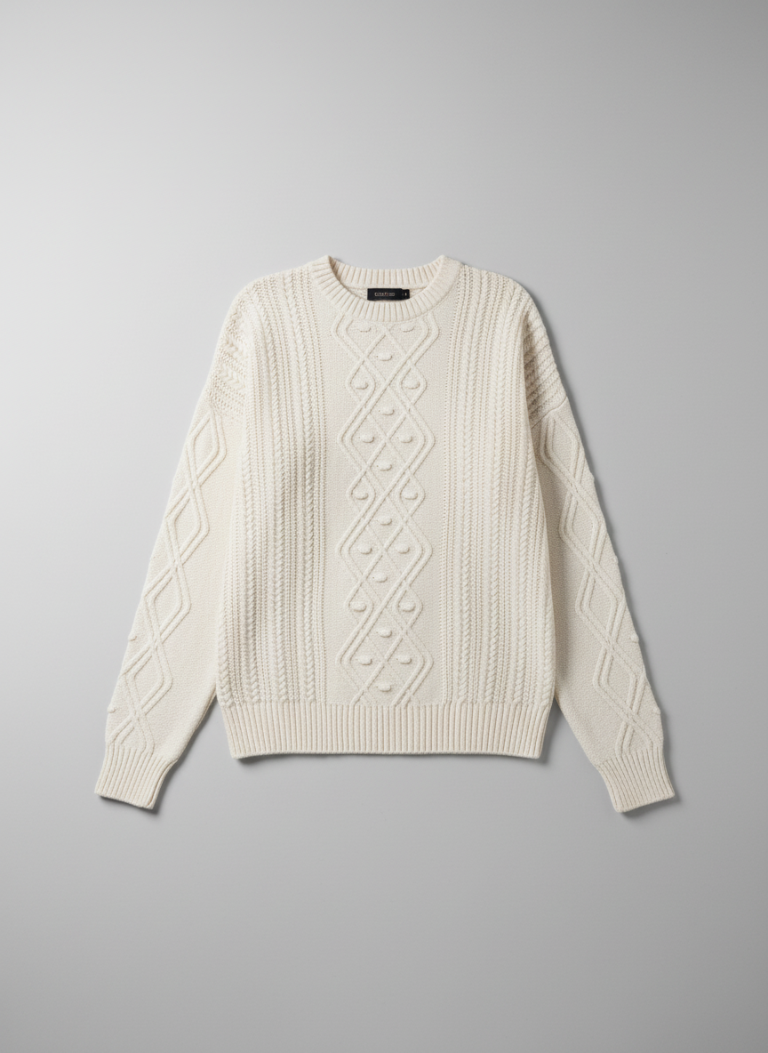 بافت سه‌بعدی و چشم‌نواز، تفاوت اصلی و نقطه قوت این پلیور را می‌سازد. این یک پلیور بافت ساده نیست؛ طراحی آن از بافت‌های سنتی و معروف ایرلندی (Aran Knit) الهام می‌گیرد. هر کدام از این طرح‌ها نمادی از هنر بافندگی هستند: