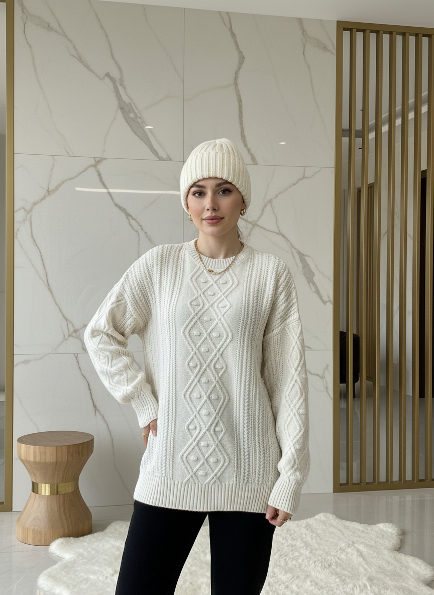 پلیور بافت زنانه یقه گرد | طرح گیس بافت کلاسیک (Aran Knit)